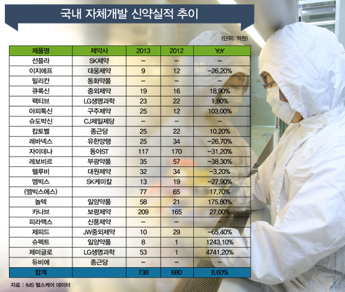국내 신약 성과는 꾸준히 이어지고 있다. 국내 신약 1호인 1999년 SK제약의 선플루자를 시작으로, 대웅제약 이지에프, 동아ST 자이데나, 일양약품 슈펙트와 놀텍, 보령제약 카나브, 2013년 종근당의 듀비에까정까지 지금까지 총 20품목의 국내개발신약이 출시돼 국내 시장은 물론 해외 시장에서도 괄목할만한 성장을 보이고 있다. 국내 제약사들의 임상시험 프로젝트 수도 2009년 198건에서 지난해 2010년 229건으로 늘었다. 하지만 국내개발신약의 판매 실적을 보면 대체적으로 저조하다는 평을 받고 있는 것이 현실이다. 지난해 1000억원을 넘은 대형품목은 2개의 품목뿐이다.