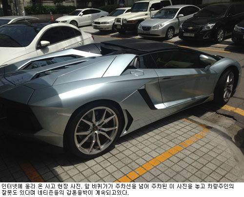 28일 IT관련 정보 커뮤니티 사이트 클리앙(www.clien.net) 게시판에는 “회사 고객이 놀러 오셨다가 지나가던 여성 차주가 주차해 놓은 아벤타도르 앞 범퍼를 치었다”며 “여성 차주는 사색이 되고 회사 고객도 놀랬다”고 설명했다. 또 “수리를 위해 독일로 보내진다”고 덧붙였다. 사고를 고발한 네티즌은 사진을 공개했다.