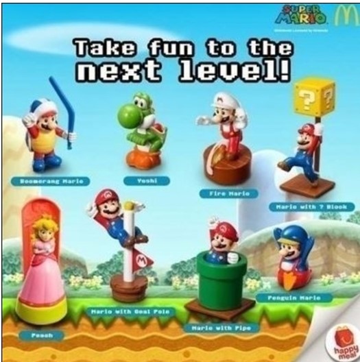 맥도날드의 해피밀 슈퍼마리오 시리즈 2차 판매에서는 파이어마리오, 부메랑마리오, 피치공주, 요시 등 슈퍼마리오 4종 캐릭터 피규어를 만날 수 있다.