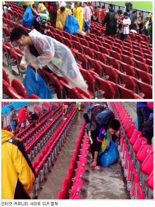 인터넷 커뮤니티 사이트에 16일 올라온 사진에는 얼굴에 일장기를 그린 응원단이 우비를 입고 파란 봉투에 쓰레기를 담고 있다. 봉투는 응원에 썼던 소품으로 보인다. 이 후 올라온 다른 사진에도 노란색 유니폼을 입은 관중들이 경기장 밖을 빠져나갈 때 일본 축구대표단 유니폼을 입은 한 관중이 허리를 숙여 의자 밑 쓰레기를 줍는 장면이 포착됐다.