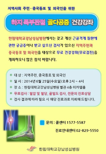 한림대학교강남성심병원 골관절센터는 오는 25일(수) 오후 2시부터 4시까지 별관 4층 미카엘홀에서 지역사회 주민과 중국동포 및 외국인을 위한 하지족부관절·골다공증 건강강좌를 개최한다.