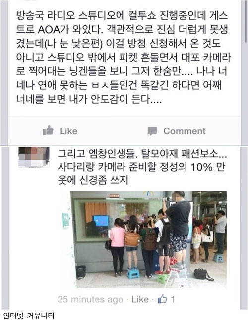 4일 유명 인터넷 커뮤니티사이트에 올라온 게시물에는 글과 사진을 올린 최초 작성자를 방송사 인턴이라고 밝혀 충격을 주고 있다. “방송국 라디오 스튜디오에 컬투쇼 진행중인데 게스트로 AOA가 왔다”며 “객관적으로 진심 더럽게 못 생겼는데 이걸 방청신청 해서 온 것도 아니고 스튜디오 밖에서 피켓 흔들면서 대포카메라로 찍는 닝겐들을 보니 그저 한숨만…”이라며 가수 AOA와 그의 팬들을 비하했다. ‘닝겐’은 인간을 뜻하는 일본말이다. 또 “나나 너네나 연애 못하는 ㅂㅅ들인건 똑같긴 하다만 어째 너네를 보면 내가 안도감이 든다”고 작성했다.