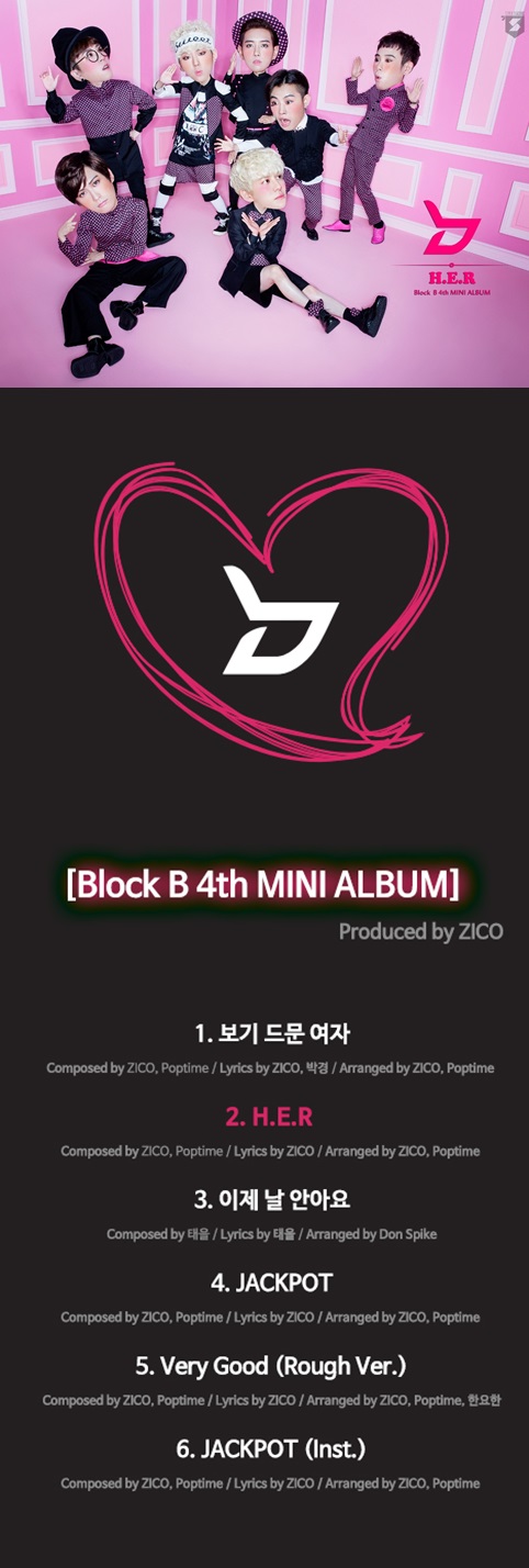 블락비는 14일 오전 공식 SNS를 통해 네 번째 미니앨범 ‘헐(H.E.R)’ 컴백 티저 이미지와 함께 트랙리스트를 공개했다. 공개된 이미지 속 블락비는 분홍빛 배경에서 사랑스럽고 개구쟁이 같은 모습을 선보였다. 앨범과 동명의 타이틀곡 ‘헐’은 영어 ‘Her’의 ‘그녀’를 뜻함과 동시에 누군가를 보고 깜짝 놀라 내뱉는 감탄사 ‘헐’이라는 이중적인 의미라고.