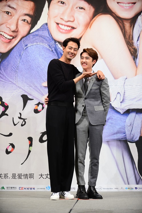 15일 서울 강남구 영동대로 임피리얼팰리스호텔에서 열린 SBS 새 수목극 ‘괜찮아, 사랑이야’ 제작발표회에서 조인성은 “도경수가 나와 가장 촬영 분량이 많다”며 “도경수가 엑소의 유명세 덕에 드라마에 합류한 게 아니냐는 의혹이 있지만 절대 아니다”라고 선을 그었다. 순수하게 연기력 때문에 캐스팅됐다는 것, 조인성은 “(도경수는)노 작가와 김규태 감독이 놀랄 정도로 연기감이 좋다”며 “이 작품을 통해 도경수가 배우로서의 가능성을 보여줄 것”이라고 호언장담했다. 이어 “방송을 보면 도경수를 예쁘게 보게 될 것”이라고 첨언하기도 했다.