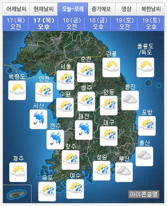 목요일인 17일 장마전선의 영향을 받아 전국이 흐리고 비가 오겠다.