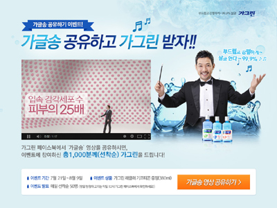 이벤트 응모 방법은 가그린 홈페이지(www.garglin.co.kr) 또는 페이스북 가그린 공식 페이지(www.facebook.com/garglin.dapharm)에 방문하여 가글송 영상을 자신의 페이스북에 공유하면 된다.