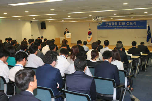 JW중외그룹은 24일 오전 서초동 JW타워에서 지주회사인 JW홀딩스를 비롯해 JW중외제약, JW중외신약 등 그룹 임직원 300여명이 참석한 가운데 ‘준법경영 강화 선포식’을 개최했다고 밝혔다.