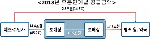 2013년 완제의약품 유통규모는 전년(2012년 44.9조원)에 비해 1.6% 증가한 45조6000억원이며, 유통단계별 공급금액은 제조·수입사가 요양기관에 직접 공급한 경우 2조5000억원, 도매상을 통해 공급한 경우 17조1000억원으로 국내 의약품이 요양기관에 공급되기까지 약 2.3단계의 유통과정을 거치는 것으로 나타났다.