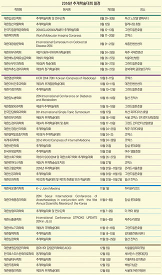 10월에는 대부분의 학회가 동시다발적으로 열린다. 올해는 특히 제32차 세계내과학회(WCIM 2014)가 10월 24~28일 닷새간 코엑스에서 열리기 때문에 대부분의 내과분야 학회가 세계내과학회 기간 중 운영되고 추계학회는 축소운영된다.