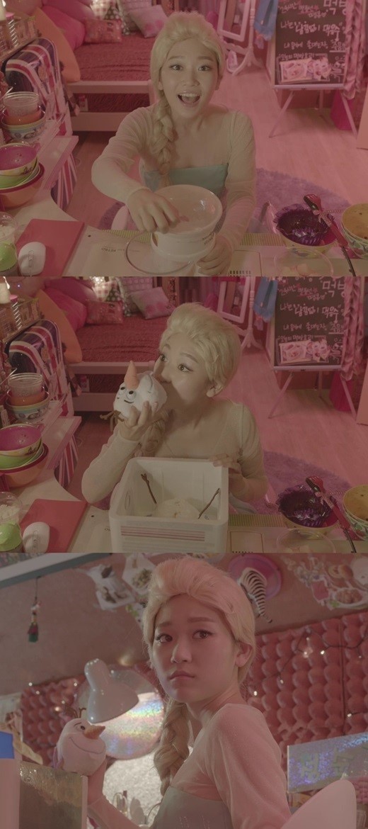 케이블 채널 tvN 목요드라마 ‘잉여공주’에서 먹방 BJ 혜영 역을 맡은 김슬기는 엘사로 분장해 방송에 임한다. 방송을 앞두고 tvN측이 공개한 사진 속에서 김슬기는 엘사의 땋은 금발 머리와 하늘빛 의상을 완벽 재현했다. 올라프 얼굴 모양의 아이스크림 케이크를 거침없이 집어먹는 달콤 살벌한 모습이 시선을 모았다.