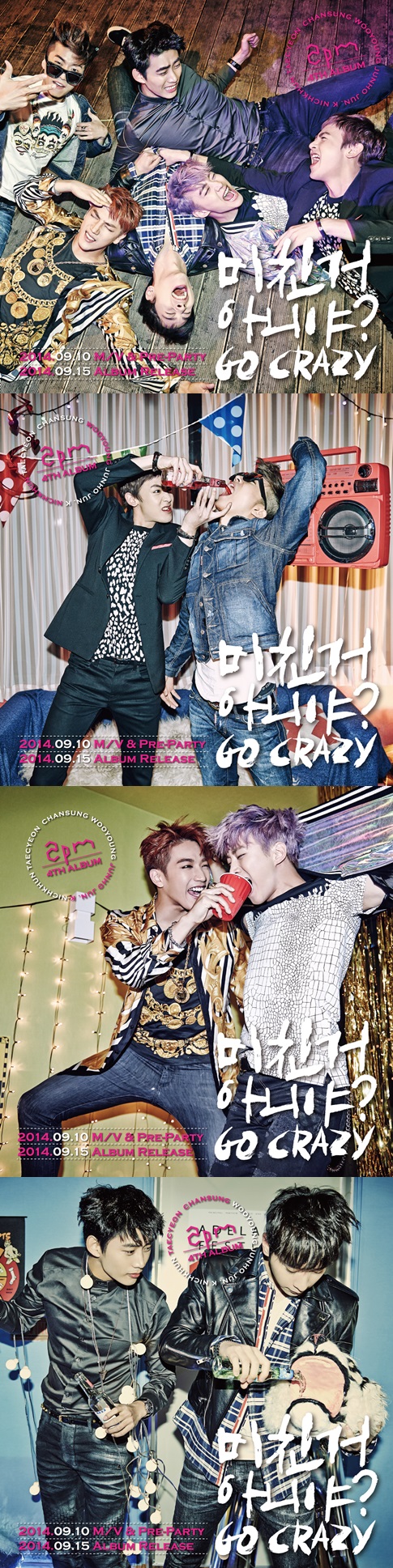 소속사 JYP엔터테인먼트는 1일 0시 2PM 공식 사이트 등을 통해 2PM의 컴백 티저 이미지 4장과 정규 4집 앨범명 ‘미친 거 아니야?’를 공개했다. 공개된 사진 속 2PM은 앨범명처럼 미친 듯이 신나게 놀고 있는 멤버들의 모습을 담았다. 또 사진 속에는 2PM의 컴백 공식일정도 새겨져 있다.