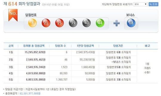 지난 6일 제614회 나눔로또 추첨 결과가 발표됐다. 1등 당첨번호는 ‘8·21·25·39·40·44’이며 보너스 번호는 ‘18’이다.