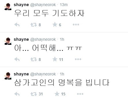 셰인은 이날 자신의 트위터에 “삼가 고인의 명복을 빕니다”라고 올린 뒤 바로 이어 “아… 어떡해… ㅠㅠ”라고 슬픔을 드러냈다. 또 “우리 모두 기도하자”라고 올리며 리세의 소식에 안타까움을 금치 못했다