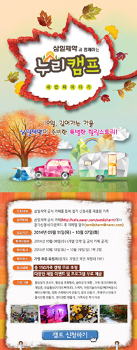 삼일제약 공식카페(http://cafe.naver.com/samilpharm)에 가입 후 누리캠프 신청게시판의 참가신청서를 내려 받아 작성한 후 담당 이메일(samilpharm@naver.com)로 발송하면 된다. 참가신청은 10월 7일까지이며 4인 가족 기준으로 총 150가족이 캠핑 참여 기회를 가질 수 있다.
