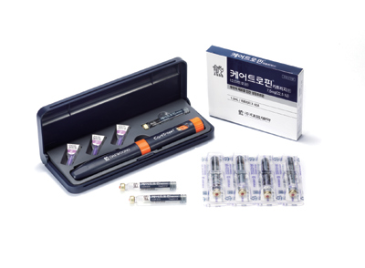 케어트로핀 전용주사기는 기존 1회용 성장호르몬 주사기와 달리, 펜 타입으로 리셋 버튼이 장착돼 용량 조절이 쉽고 환자 스스로 안전하게 주사 할 수 있도록 고안됐다. 편의성이 뛰어나 장기간 자가 주사를 해야 하는 성장호르몬뿐만 아니라 인슐린 등 바이오 의약품에 적용이 가능하다.