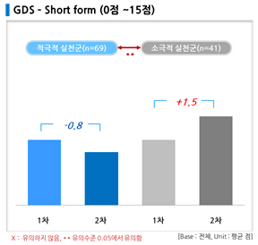 특히 치매환자의 우울정도(GDS)를 파악한 결과, 일상생활지침을 적극적으로 실천한 그룹은 우울감이 다소 낮아졌으나 그 변화 폭이 적었다.