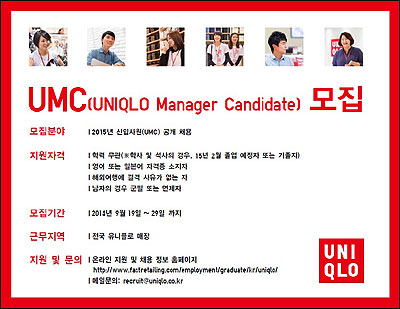 이번에 채용되는 유니클로의 신입사원은 모두 UMC(UNIQLO Manager Candidate, 점장 후보직) 자격으로 2015년 3월부터 전국 유니클로 매장에서 근무하게 된다. 지원 자격에 학력 제한은 없으며, 영어 또는 일본어 공인 인증 점수 소지자, 해외여행에 결격 사유가 없는 자, 남자의 경우 군필 또는 면제자이면 가능하다. 학사 및 석사의 경우 2015년 2월 졸업 예정자 또는 기졸자에 한해 지원이 가능하다. 지원 희망자는 오는 29일까지 유니클로 채용 홈페이지(www.fastretailing.com/employment)에 접속해 온라인 지원서를 작성하면 된다.