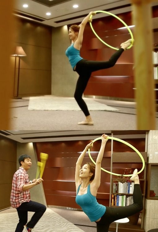 오 아나운서는 후프와 볼을 이용한 동작을 선보였다.