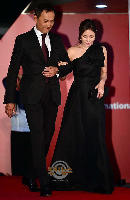 배우 와타나베 켄, 문소리(왼쪽부터)가 2일 오후 부산 해운대구 우동 영화의 전당에서 열린 '제19회 부산국제영화제'(BIFF) 개막식에 참석해 포토월에서 포즈를 취했다.