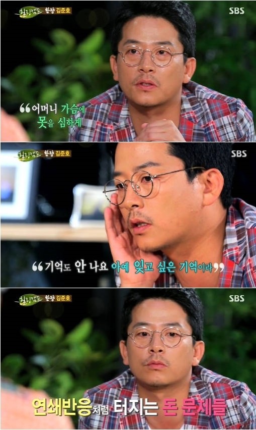 김준호는 6일 방송된 SBS 예능프로그램 ‘힐링캠프 기쁘지 아니한가’(이하 힐링캠프)에 게스트로 출연해 자신의 가정사를 고백했다. 이날 김준호는 “아버지가 임원으로 있던 회사에서 다른 임원이 회사를 빼돌렸다”며 자신의 불행했던 과거사를 털어놨다. 회사를 잃은 김준호의 아버지는 빚 독촉을 피해 4~5년간 도피 생활을 했고, 그 뒤 뇌경색이 왔다고. 간신히 김준호의 성공으로 집안 형편이 필 무렵 “2009년 도박 사건으로 어머니 가슴에 못을 심하게 박았다”고 김준호는 털어놨다.