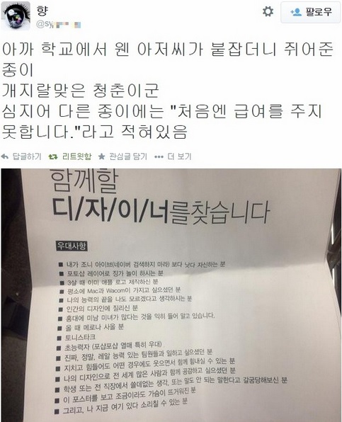 13일 인터넷 커뮤니티에 한 게시물이 올라왔습니다. 함께 할 디자이너를 찾는다는 구인 전단인데요. 이 사진을 처음 올린 작성자는 ‘향(@syuhyang)’이란 아이디를 쓰고 있는 트위터리안입니다. 작성자는 “아까 학교에서 웬 아저씨가 붙잡더니 쥐여준 종이”라며 사진을 공개했습니다. 이어 “심지어 다른 종이에는 ‘처음엔 급여를 주지 못 합니다’라고 적혀있었다”라고 하네요. 우대사항이 깁니다. 한 번 볼까요?