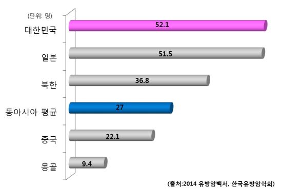 특히 한국인 유방암 발생률이 일본을 앞서며 동아시아 국가 중 최고 자리에 올랐다. 우리나라에서 2008년 10만 명당 38.9명꼴로 발생하던 유방암은 2012년에는 10만 명당 52.1명꼴로 매우 증가했다.