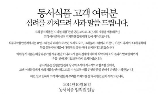 동서식품의 공식 사과는 지난 13일 식품의약품안전처에서 대장균이 검출된 포스트 아몬드 후레이크의 유통판매 금지 조치를 밝힌 지 3일 만이다. 식약처는 동서식품이 충북 진천공장에서 시리얼 제품 대장균군을 확인하고도 폐기하지 않고 다른 제품들과 섞어 완제품을 생산한 정황을 포착했다.