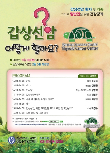 강좌는 누구나 사전 등록 없이 무료로 참여 가능하고, 강남세브란스 갑상선암센터 카페(http://cafe.naver.com/thyroidfamily)에 가입하면 보다 많은 정보를 얻을 수 있다.