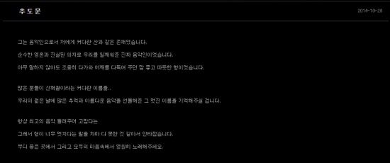 서태지는 “항상 최고의 음악 들려주어 고맙다는 그래서 형이 너무 멋지다는 말을 차마 다 못한 것 같아서 안타깝습니다. 부디 좋은 곳에서 그리고 모두의 마음속에서 영원히 노래해 주세요”라는 말을 전했다.