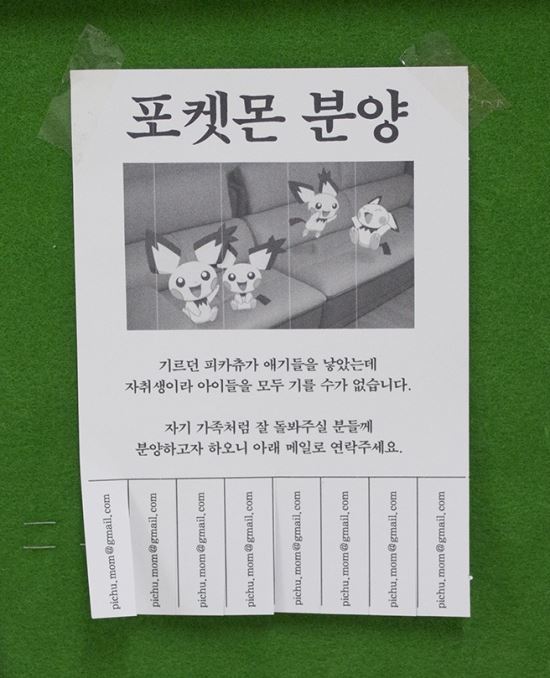 최근 SNS와 인터넷 커뮤니티는 ‘포켓몬 분양’ 전단지로 떠들썩합니다. 네티즌들은 서울 홍대와 신촌 근처에 붙어 있던 전단을 찍어 인터넷에 올렸는데요. 한 번 볼까요? 귀여운 포켓몬의 그림과 함께 있는 글에는 “기르던 피카츄가 아기들을 낳았는데 자취생이라 모두 기를 수가 없다”며 “‘피츄’를 자기 가족처럼 돌봐주실 분들께 분양하고자 하니 아래 메일로 연락 달라”는 내용이 적혀 있습니다. 피츄는 포켓몬 피카츄의 진화 전 이름입니다. 피츄-피카츄-라이츄 순으로 진화하죠.