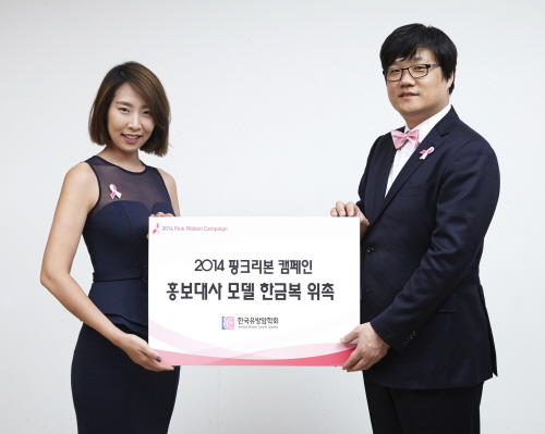 한국유방암학회는 유방암을 이겨내고 더 건강하게 제2의 인생을 살고 있는 모델 한금복 씨에게 2014 핑크리본 캠페인 홍보대사 위촉장을 수여하고 유방암 예방 메시지 확산을 위해 함께 노력해 주기를 당부했다.