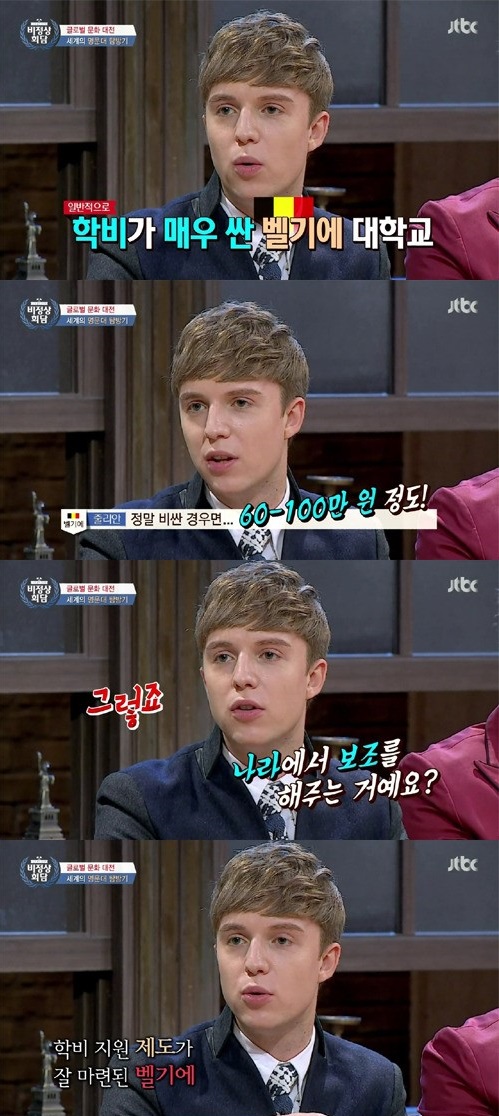벨기에 대표 줄리안은 “벨기에는 학비가 매우 싸다”며 “친형이 1년에 10만 원을 내고 학교에 다녔다”고 밝혀 놀라움을 자아냈다. 이어 “정말 비싼 경우면 60~100만 원 정도 된다고 하더라. 나라에서 사람들이 대학교 쉽게 다닐 수 있게끔 보조를 해준다”고 밝혔다.