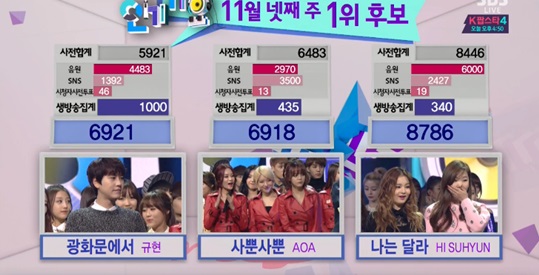 23일 오후 방송된 SBS ‘인기가요’에서는 1위 후보로 규현, AOA, 하이 수현이 올랐다. 규현의 ‘광화문에서’가 최근 음원차트에서 1위를 달리며 1위가 유력시된 상황. 그러나 규현보다 일주일 먼저 음원이 출시돼 차트에서 유리했던 하이 수현이 1위를 거머쥐었다.