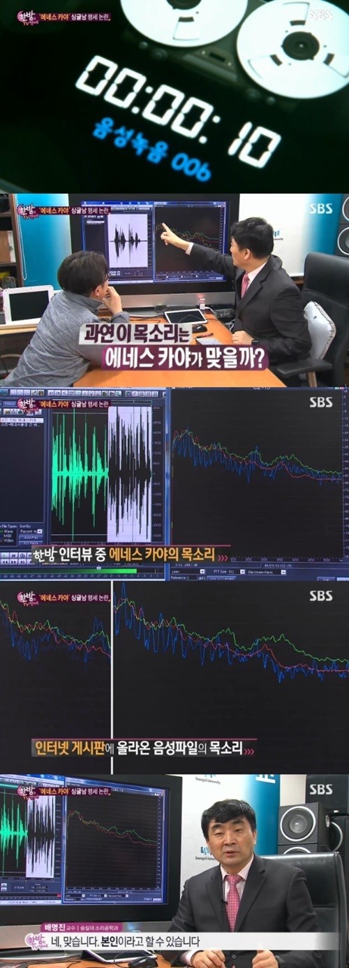 숭실대 소리공학과 배명진 교수는 에네스 카야 사건의 피해자라 주장하는 여성이 증거 자료로 제출한 음성 파일과 방송에서 출연했던 에네스 카야의 음성을 비교했다. 배 교수는 “목소리에서 콧소리 같은 끌림이 나타난다. 이 부분이 동일한 기울기를 유지하고 있다”며 “음성파일의 목소리와 에네스 카야의 목소리가 일치한다”고 밝혔다.