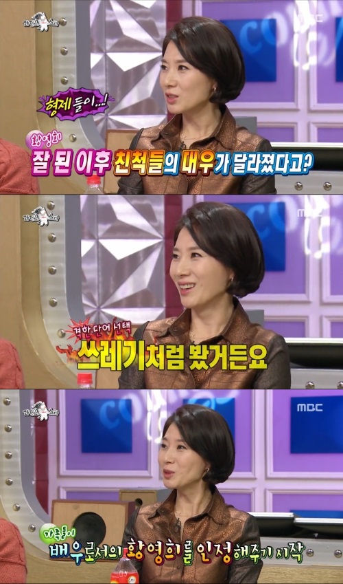 황영희는 MBC 드라마 ‘왔다 장보리’ 이후 달라진 주변 반응을 묻는 질문에 “친척까진 아니고 형제들이 그 전에는 정말 쓰레기처럼 봤다”고 말해 좌중을 놀라게 했다.