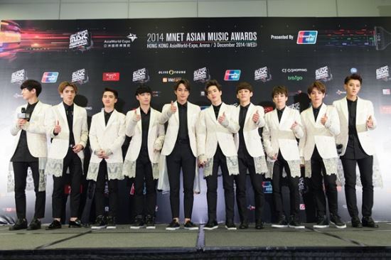그룹 엑소가 3일(현지시간) 홍콩 아시아월드 엑스포 아레나에서 열린 2014 MAMA(2014 Mnet Asian Music Awards) 시상식에 참석해 대상 수상소감을 말하고 있다.
