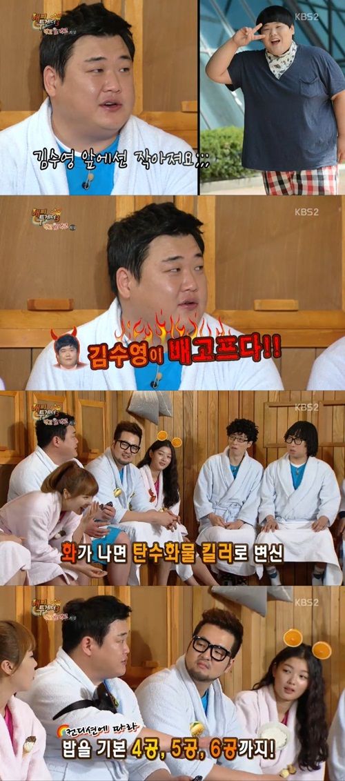 4일 방송된 KBS 2TV ‘해피투게더3는’ 먹고 또 먹고 특집으로 꾸며졌다. 김유정, 김태우, 김준현, 홍진영, 페이가 게스트로 출연해 입담을 자랑했다.