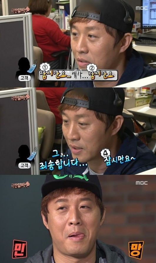 짧은 교육을 받고 실전에 투입된 정준하는 첫 통화부터 버벅댔다. 고객이 주문 정보를 요구하자 정준하는 “잠시만요”를 연발하며 일을 처리하지 못했다. 이어 수십 통의 전화를 받으면서 “죄송합니다”라는 말을 해야 했다.