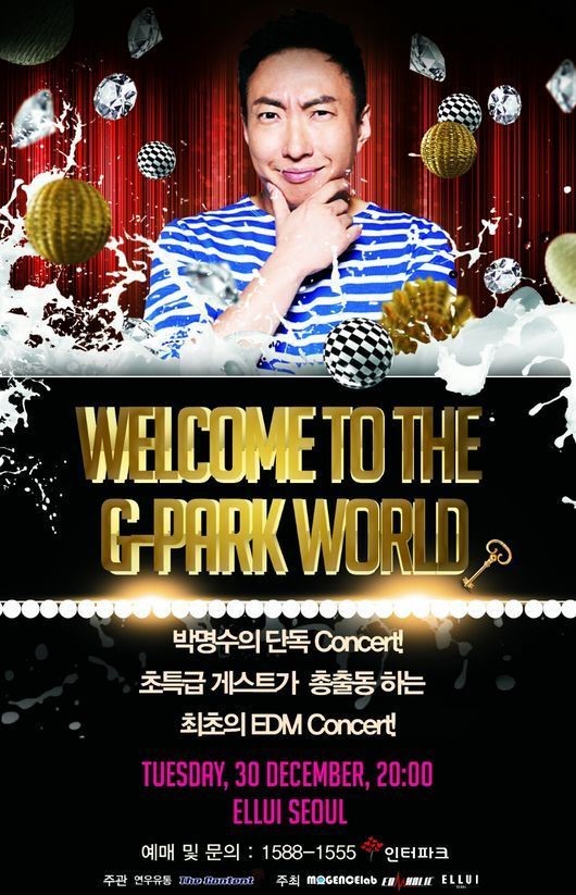박명수의 소속사 거성엔터테인먼트 관계자는 10일 “박명수가 오는 30일 서울 강남구 청담동에 있는 엘루이에서 단독 콘서트 ‘Welcome to the G-PARK world’를 개최한다. 박명수가 DJ로 활동하며 DJ PARK으로 처음 여는 단독 콘서트라 굉장히 열심히 준비하고 있다”고 밝혔다. 이어 “디제잉을 하는 한편 노래도 부른다”며 “초특급 게스트가 총출동할 것”이라고 덧붙여 콘서트에 대해 기대감을 높였다.