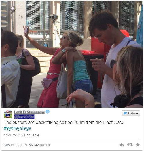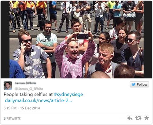 무엇을 기념하고 싶었던 걸까요? 수십명의 생사가 걸려 있던 호주 시드니 인질극 현장에서 이해할 수 없는 일이 일어났습니다. 전 세계인을 경악하게 한 것은 인질범만이 아니었습니다. 마치 재밌는 구경거리라도 생긴 듯 사진을 찍어대는 사람들이 있었습니다.