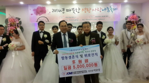 KMI한국의학연구소(이하 KMI)는 25일 경기도 광주 문화컨벤션웨딩홀에서 열린 ‘2014년 따뜻한 성탄사랑나눔축제’의 다문화가정, 외국인근로자 합동결혼식에 참석해 후원금을 전달했다.