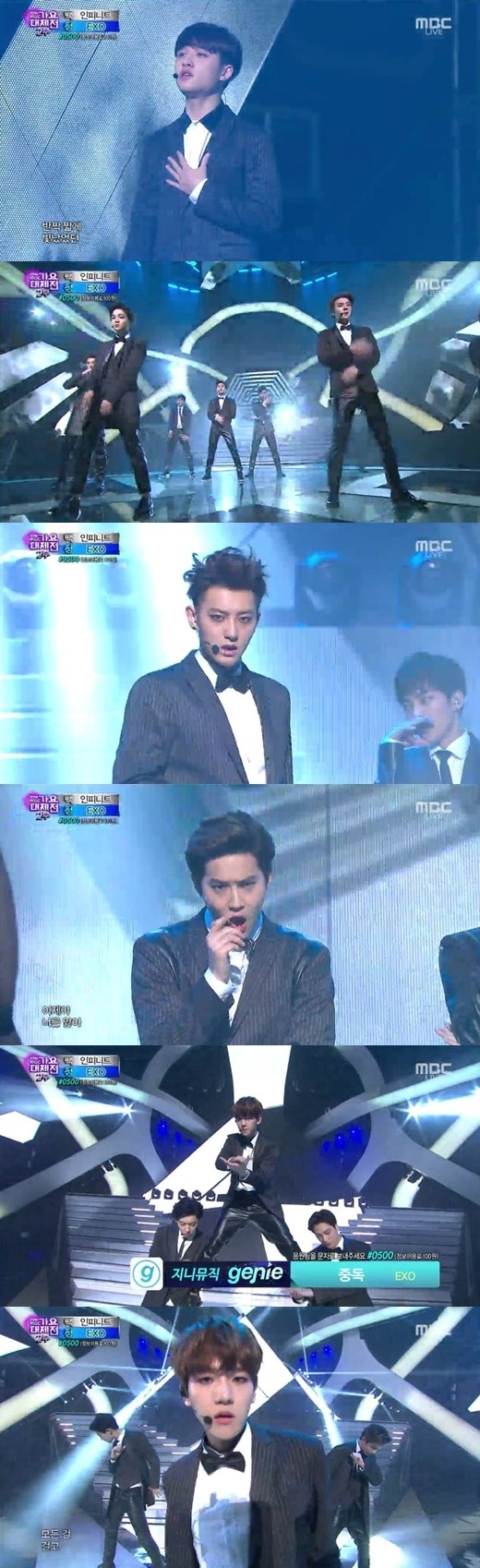 31일 오후 서울 마포구 상암동 MBC 신사옥에서 생방송으로 진행된 2014 MBC ‘가요대제전’이 방송됐다. 이날 엑소는 중국 방송 참여차 직접 생방송에 참여하지는 못했지만 사전 녹화된 무대로 시청자들을 만났다. 엑소의 앨범 수록곡 ‘썬더’에서는 멤버 디오와 백현의 목소리가 돋보였다. 또 올해 발표한 타이틀곡 ‘중독’을 선보인 엑소는 탄탄한 라이브로 팬들의 환호를 이끌어냈다.