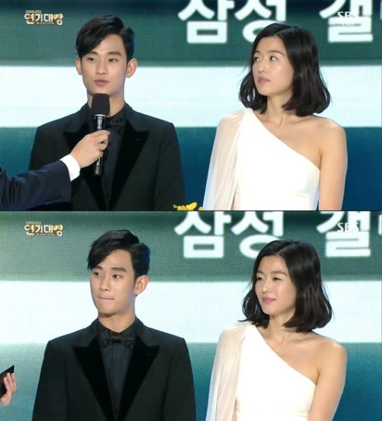 전지현은 이어 “며칠 전에 ‘별에서 온 그대’를 재방송으로 다시 봤다. 수현씨가 연기를 너무 잘했더라. 천송이는 캐릭터 상 많이 보여주는 역할인데 수현씨가 굉장히 잘 받아줬다. 베스트커플상도 김수현씨가 잘 해줬기 때문에 우리 커플이 빛났던 것 같다”고 칭찬했다.