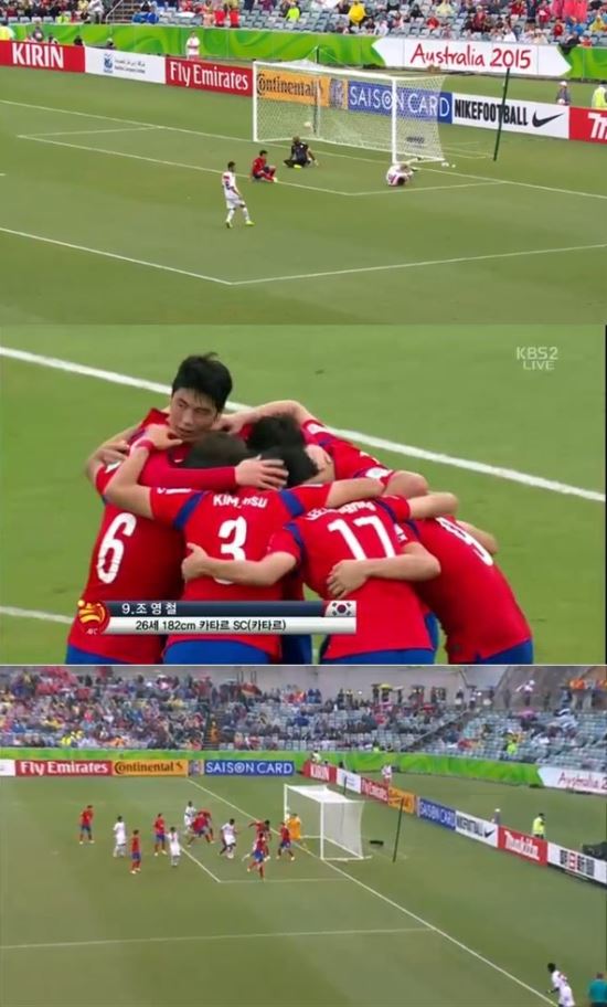 하지만 오른쪽 날개로 나선 ‘공격의 핵’ 이청용이 상대의 강한 태클에 오른쪽 다리를 다치면서 부상으로 실려나가 우려를 자아냈다. 한교원(전북)이 이청용 대신 교체투입됐다. 이후 실점 위기를 막아낸 한국은 결승골을 지켜냈다.