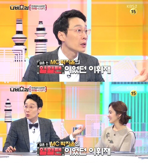 이휘재는 “총각 때, 박지윤 전 KBS 아나운서가 최동석 아나운서와 사귄다는 것을 모르고 ‘개인적으로 팬이다’고 호감을 표현한 적이 있다”고 밝혔다.