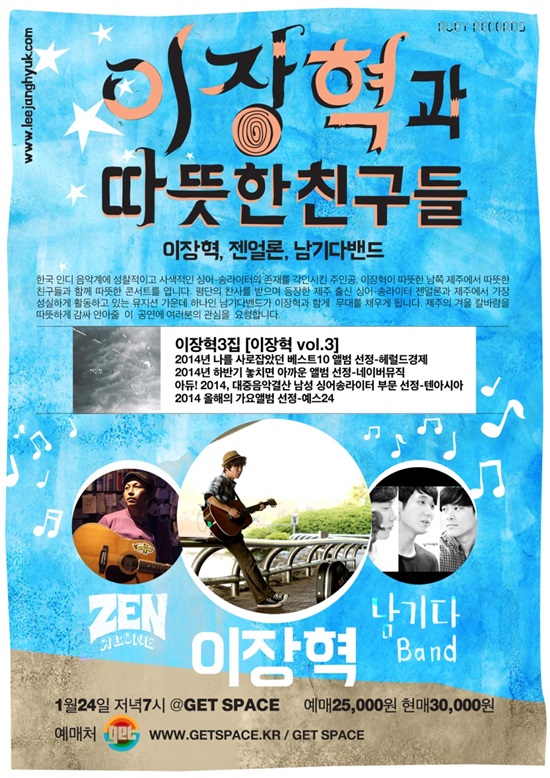 이장혁은 ‘이장혁과 따뜻한 친구들’이라는 제목의 2부작 공연의 두 번째를 제주 출신 싱어송라이터 젠 얼론, 남기다 밴드와 제주시 이도2동 겟스페이스에서 함께한다. 첫 번째 공연은 지난해 12월 31일 서울 에반스 라운지(Evans Lounge)에서 싱어송라이터 오소영, 나비, 팝 밴드 머쉬룸즈(Mushru:ms)가 함께했다.