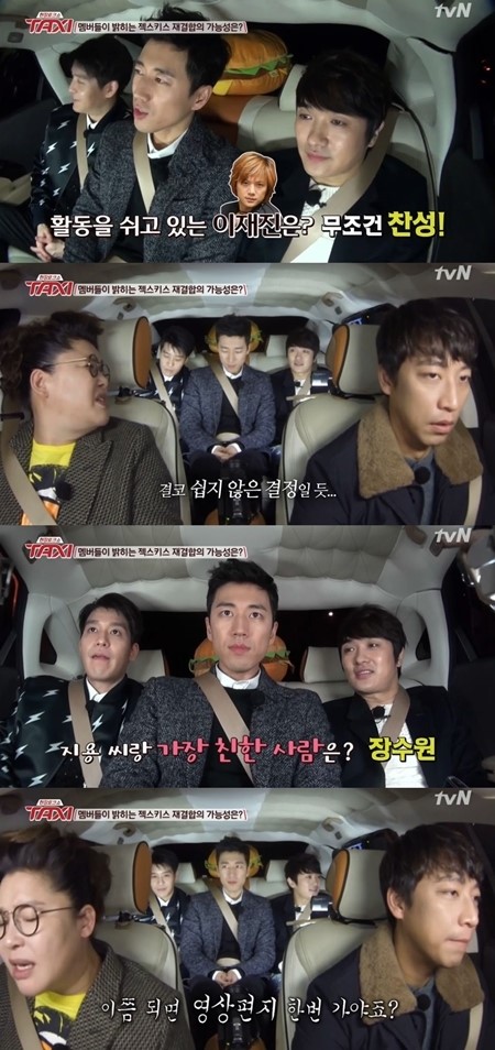 27일 오후 방송된 케이블채널 tvN 예능프로그램 ‘현장토크쇼 택시’에서는 1990년대 인기를 누린 아이돌 그룹 젝스키스의 멤버들이 게스트로 출연했다. 이날 강성훈과 김재덕, 장수원이 모이자 진행을 맡은 오만석은 “재결합 이야기는 안 나오냐”고 물었다. 이에 장수원은 “그런 이야기를 하기는 했다”고 답해 시선을 모았다.