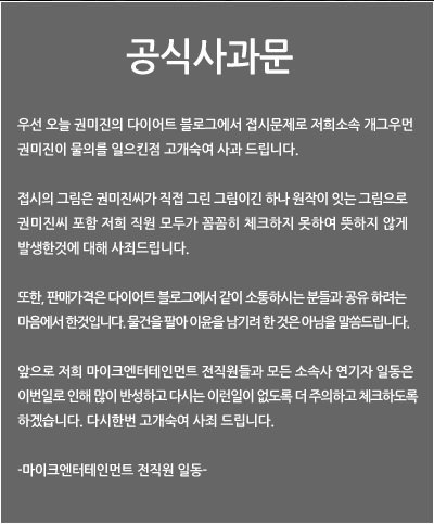이어 “접시의 그림은 권미진이 직접 그린 그림이긴 하나 원작이 있는 그림으로 권미진 포함 저희 직원 모두가 꼼꼼히 체크하지 못하여 뜻하지 않게 발생한 것에 대해 사죄드린다. 판매가격은 다이어트 블로그에서 같이 소통하는 분들과 공유하려는 마음에서 한 것이다. 물건을 팔아 이윤을 남기려 한 것은 아님을 말씀드린다”고 말했다.