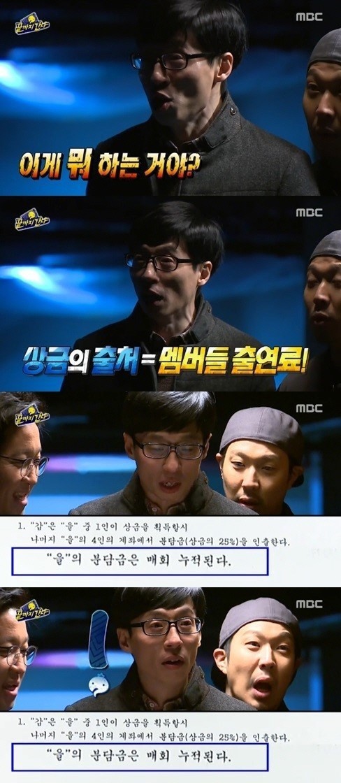 정준하가 상금을 타자 다른 멤버들에게는 문자가 날아왔다. 유재석이 받은 문자에는 “정준하가 가져간 상금 100만원 중 1/4인 25만원이 유재석의 MBC 출연료 계좌에서 인출된다”고 적혀 있었다. 알고 보니 상금은 멤버들 출연료에서 지급된다는 내용이 프로그램 직전 작성된 계약서에 포함돼 있었던 것.