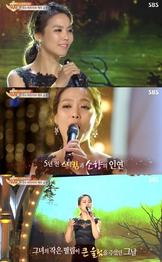 7일 오후 방송된 SBS ‘놀라운 대회 스타킹’ 400회 특집에서는 그 동안 출연했던 화제의 주인공들을 다시 초대했다. 이날 ‘인생역전킹’ 부문 1위로 김혁건과 소향이 꼽혔다. 소향은 이날 출연해 이선희의 ‘인연’을 불러 패널들에게 감동을 선사했다.